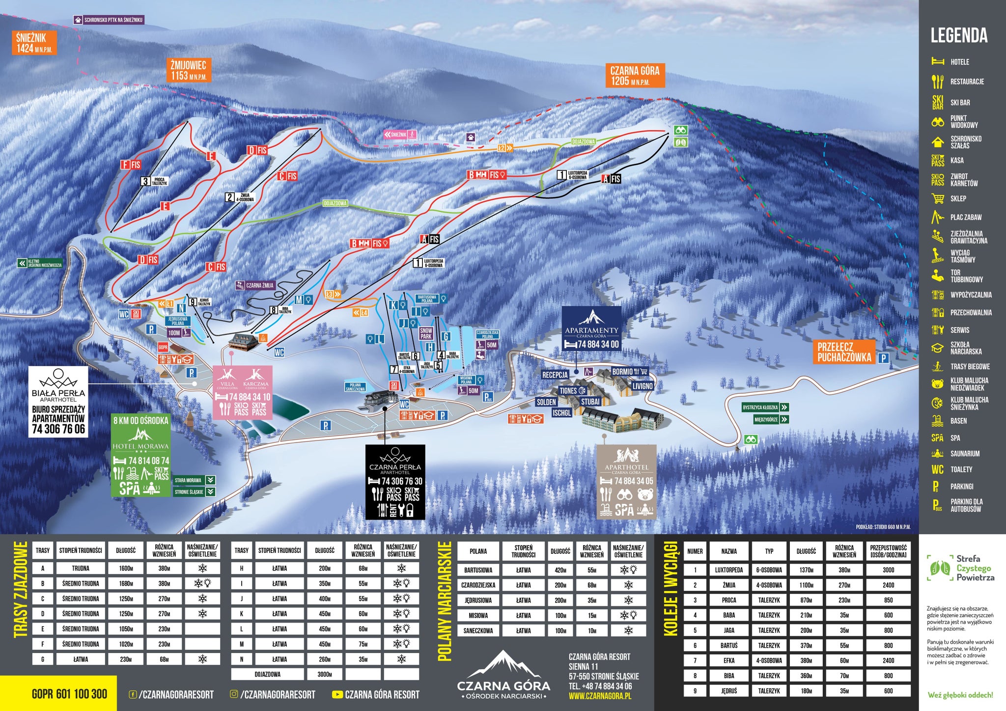 Czarna Góras skidterräng sträcker sig över de nordöstra sluttningarna av Czarna Góra (1 205 m) och Zmijowiec (1 153 m), med en fallhöjd på 379 m och totalt 14,7 km pister. Skidområdet är uppdelat i flera zoner, var och en betjänad av en blandning av snabba sexstolsliftar, fyrstolsliftar, tvåstolsliftar och släpliftar. Luxtorpeda-liften är en höjdpunkt som når toppen på bara 3 minuter och ger tillgång till ortens längsta nedfart, den 1,7 km långa B FIS-pisten.